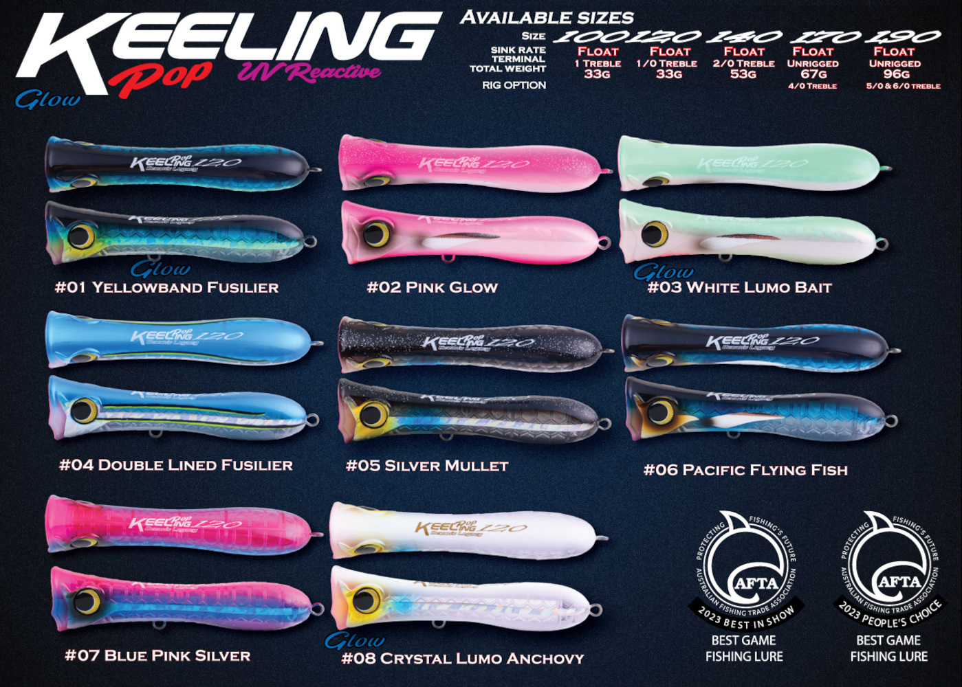 The Keeling Pop is available in 5 sizes and 8 irresistible colours including our special UV paint to cover everything from reef flats to the largest bluewater pelagic and seriolas.